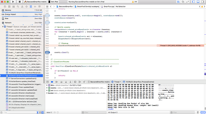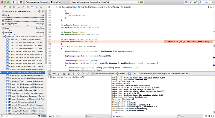 Technologies I am using : Cocos2dx 3.16, SFS2X C++ API 1.7.5, Xcode version 9.3.