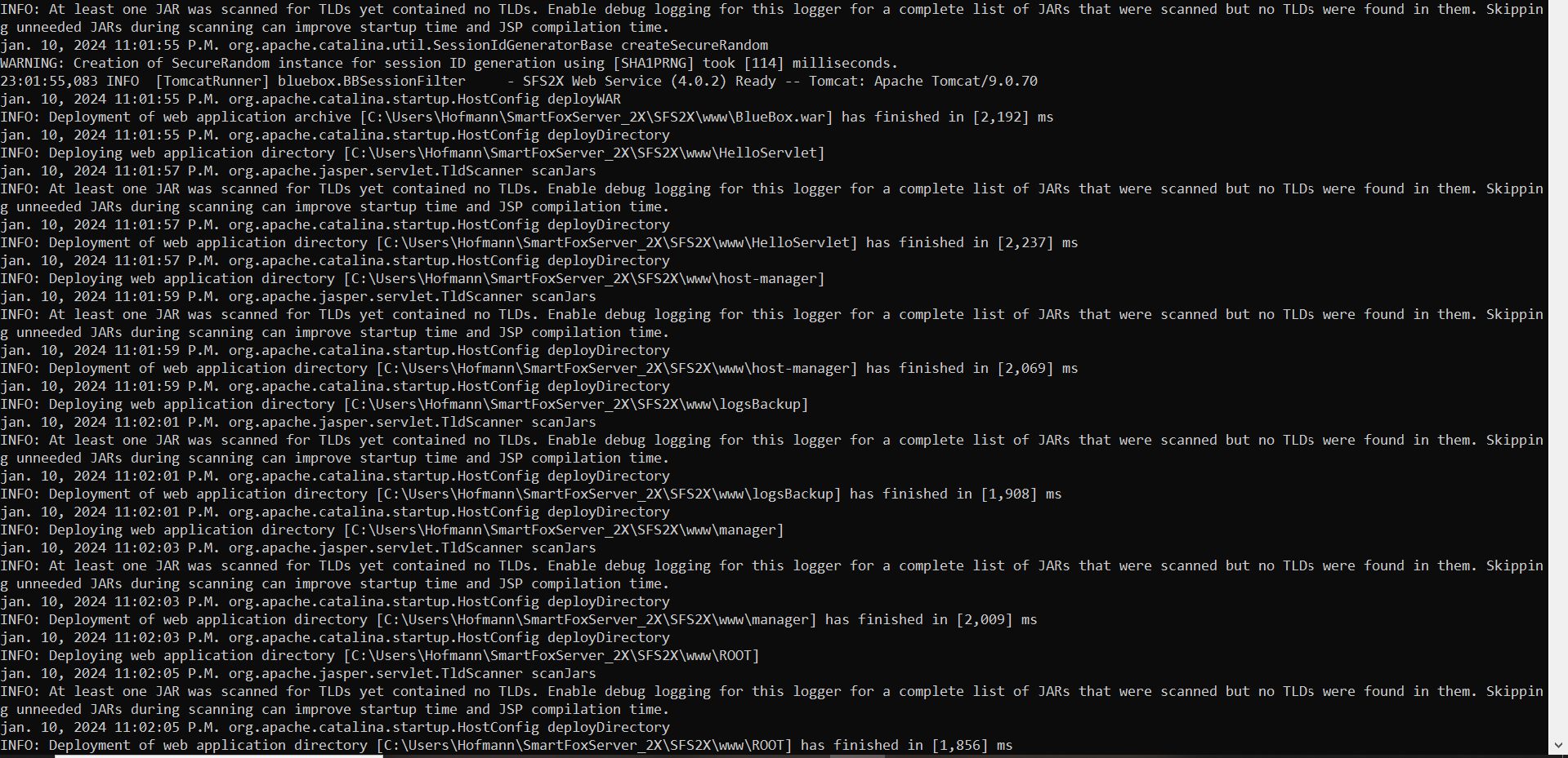 Second, the startup time for the SFS2X Server is quite long due to TLD scanning of JARs, I would like to disable this scanning if possible...